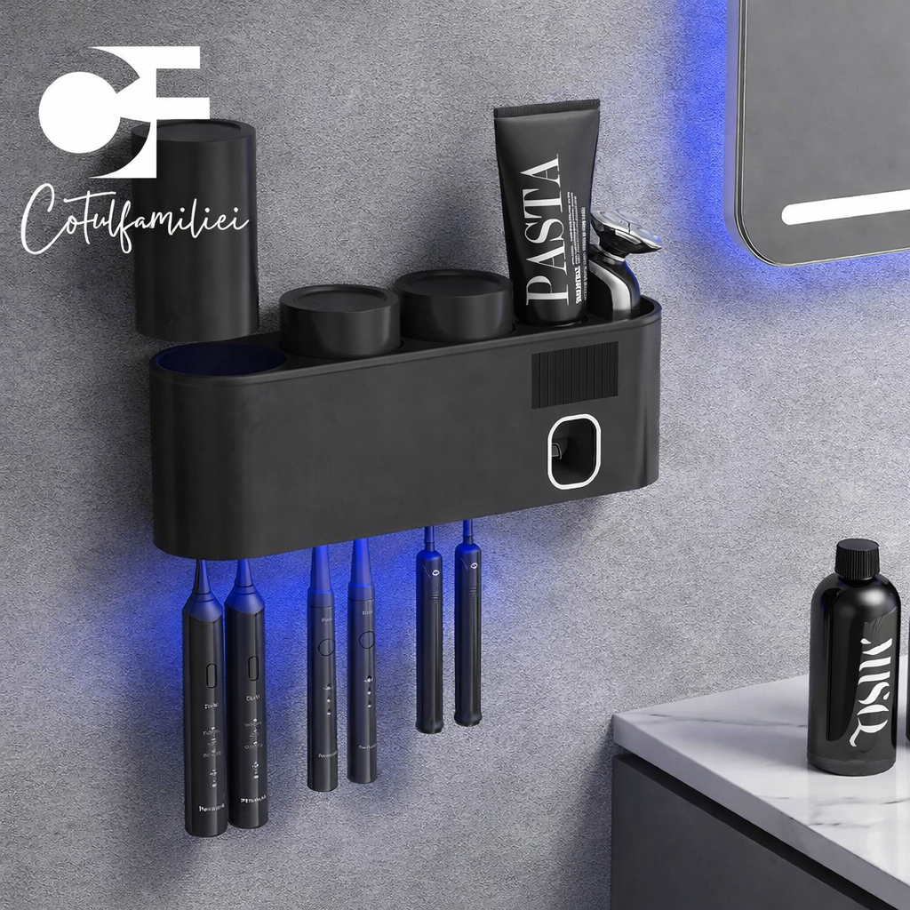 Dispenser Automat de Pastă de Dinți cu Suport pentru Periuțe și Sterilizare UV – Montare pe Perete