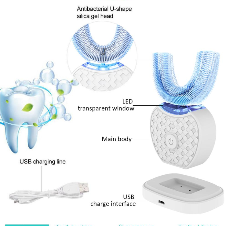 Această periuță de dinți electrică inovatoare 360° în formă de U oferă o curățare dentală completă și eficientă pentru adulți, combinând tehnologia sonică de înaltă frecvență cu un design ergonomic modern.